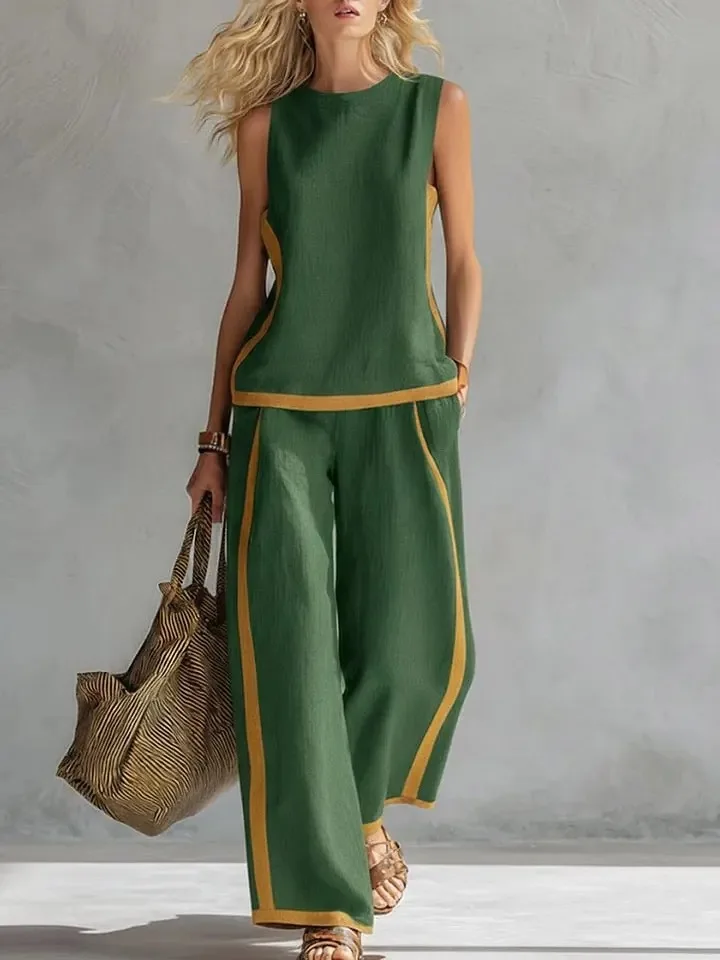 Color Blocking Loose Women Summer Sleeveless Sportswear 2PCS Matching Set O-Neck Wide Leg Pant Pocket Ladies Outfit Streetwear