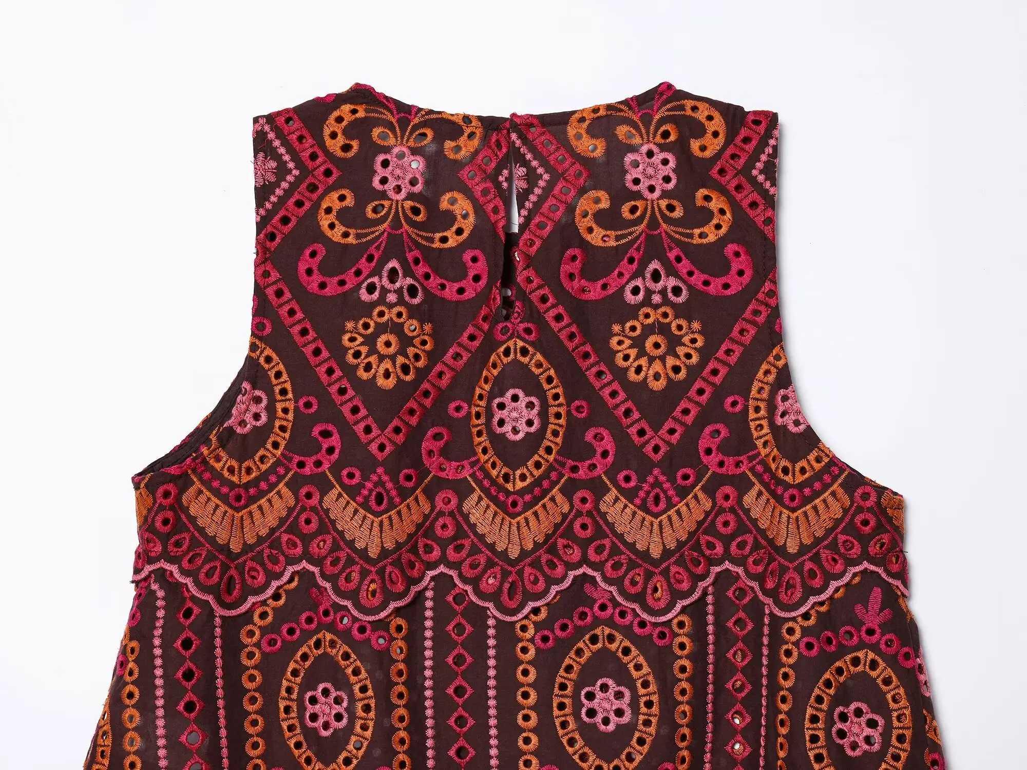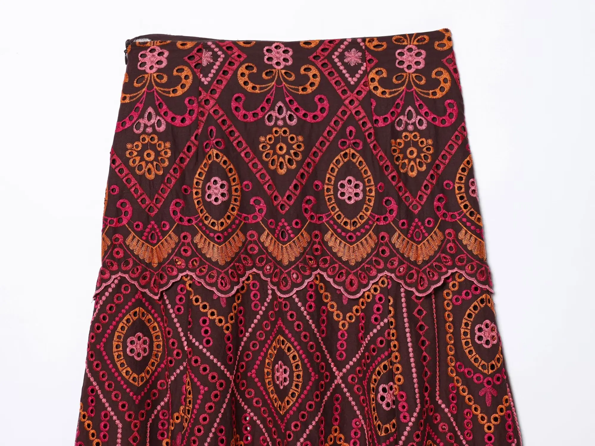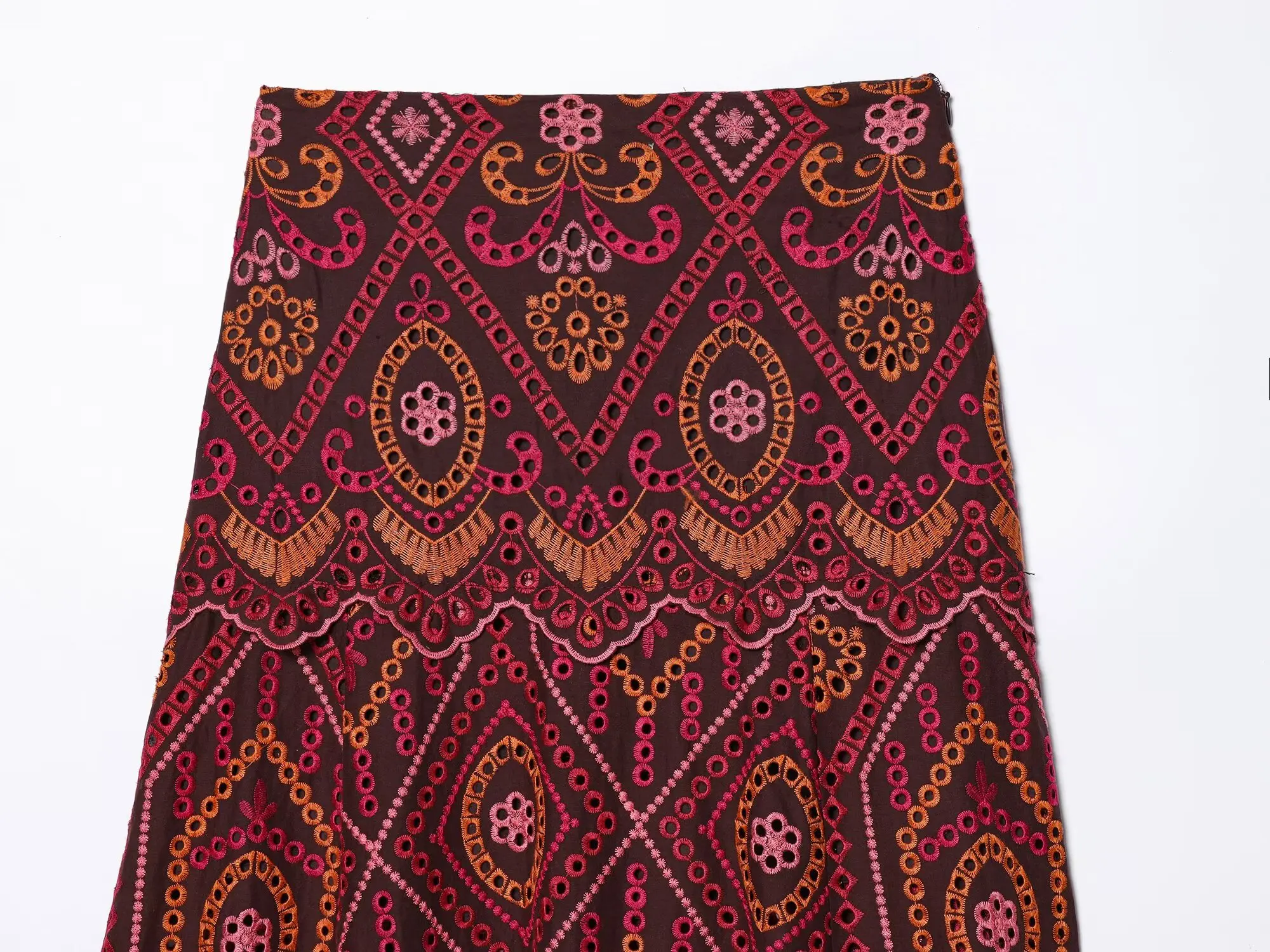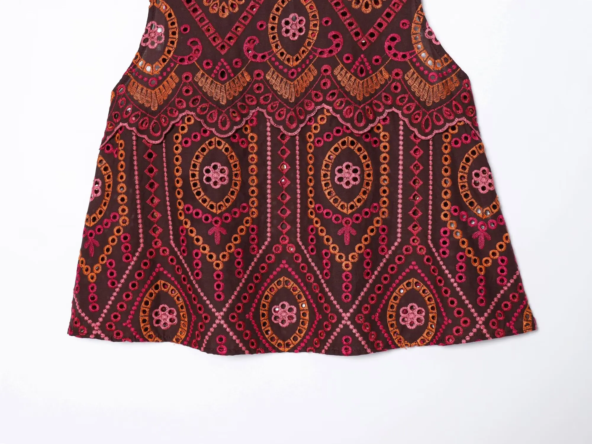 HH Woman Fashion O-Neck Embroidery Hollow Sleeveless Short Tops+Side Zipper Pleated Midi Skirt Casual Printed Spring 2 Piece Set